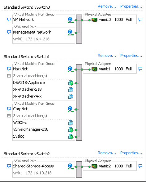 Hình 7 là ảnh chụp một mô hình mạng được sử dụng để cho thấy các phương pháp phổ biến trong khi triển khai mạng ảo hóa. Chú ý : Mô hình ảo hóa này không sử dụng VLAN. Trong môi trường ảo hóa này, máy ảo sẽ được phép truy cập đến tất cả các máy khác nằm trong mạng lưới. Không, chuyện này không nên diễn ra như thế !